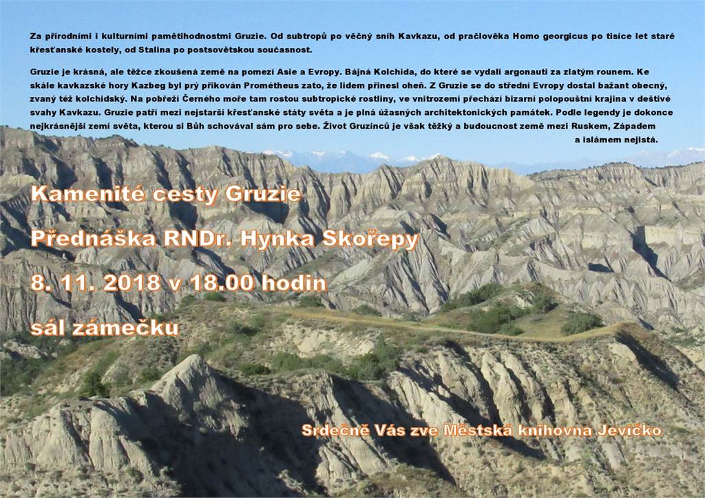 Přednáška RNDr. Hynka Skořepy, která vás zavede za přírodními i kulturními pamětihodnostmi Gruzie. Od subtropů po věčný sníh Kavkazu, od pračlověka Homo georgicus po tisíce let staré křesťanské kostely, od Stalina po postsovětskou současnost.