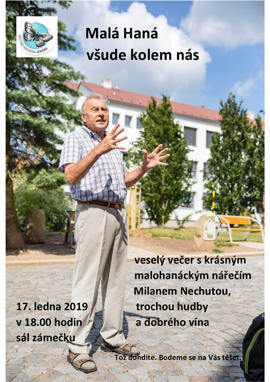 a k ní neodmyslitelně patří hanácké nářečí. To naše, které slyšíte všude kolem Jevíčka, Vám přijde připomenout Milan Nechuta. Ve čtvrtek, 17. ledna 2019 v 18.00 hodin na sále zámečku, budete mít příležitost od srdce se zasmát jeho vtipnému, hanáckému vyprávění.